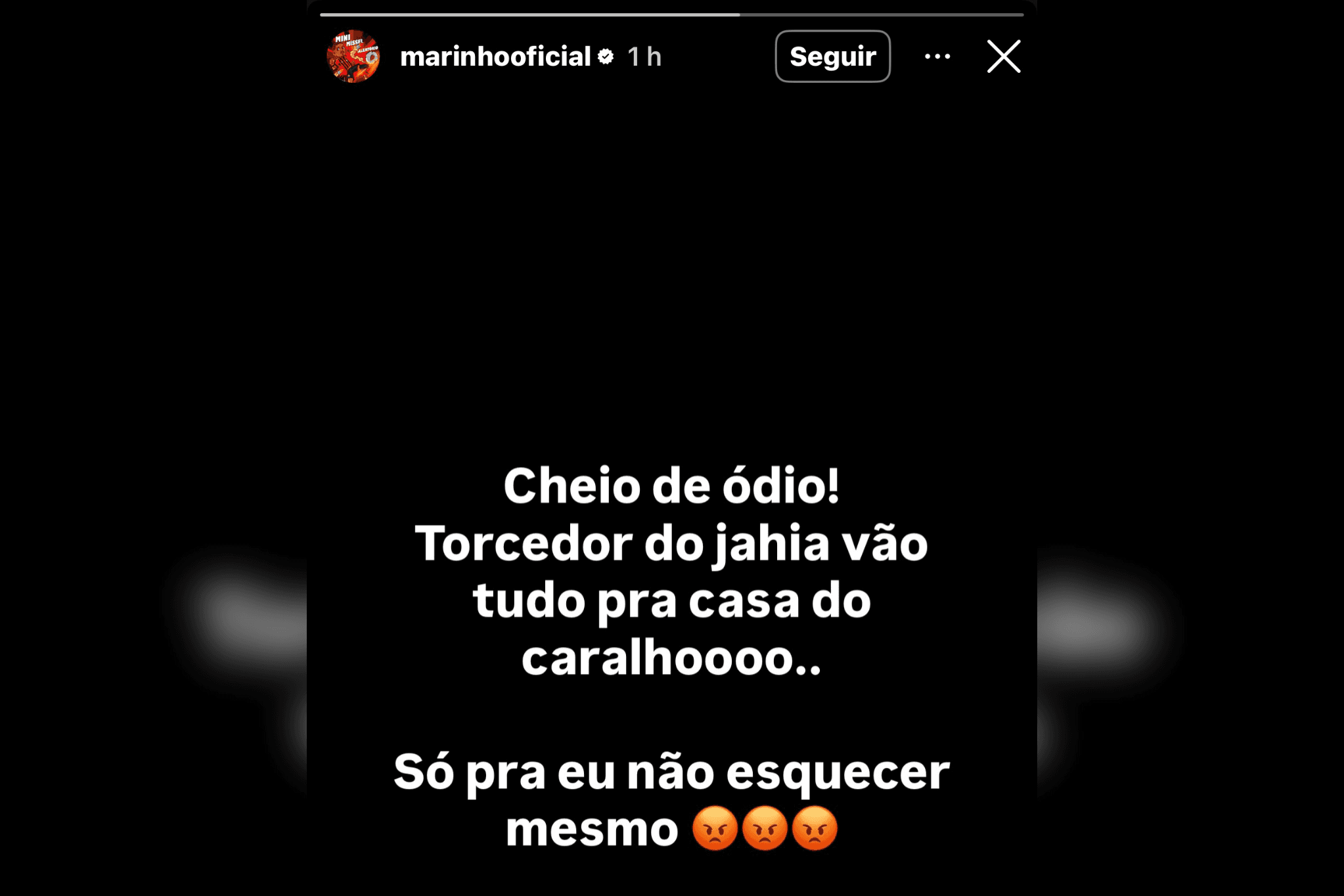 Após a derrota para o Bahia, ele colocou um recado no Instagram pessoal. “Cheio de ódio. Torcedor do Jahia vão tudo pra casa do caralhooo. Só pra eu não esquecer mesmo”, desabafou na rede social.